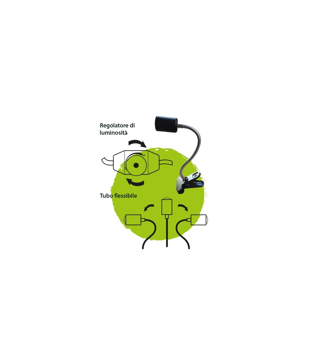 Il portalampada con pinza e tubo flessibile, include cavo di alimentazione con regolatore di luminosità, attacco E27.